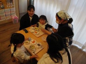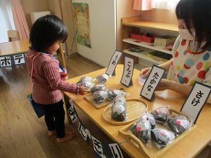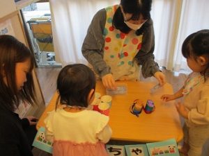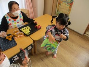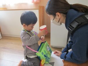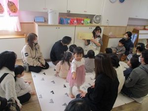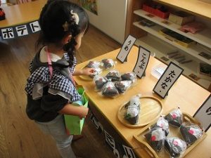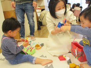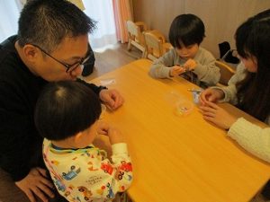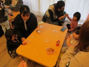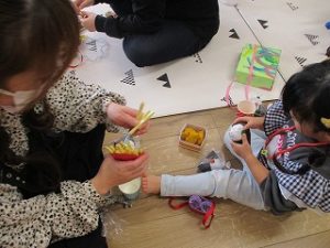 1・2歳児クラスの保育参観で、お店屋さんごっこをしました。親子で楽しい時間を過ごしました。
